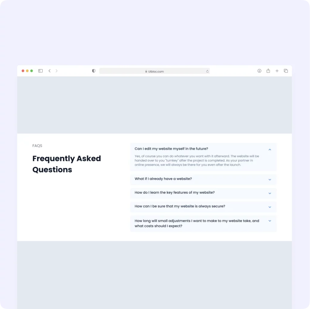 FAQS Frequently Asked Questions Can I edit my website myself in the future? Yes, of course you can do whatever you want with it afterward. The website will be handed over to you “turnkey” after the project is completed. As your partner in online presence, we will always be there for you even after the […]