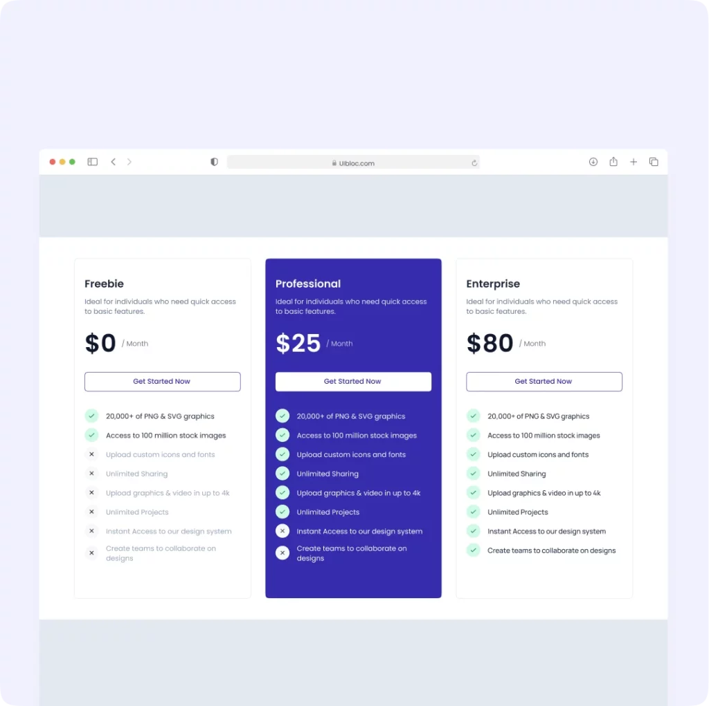 Freebie Ideal for individuals who need quick access to basic features. $0 / Month Get Started Now 20,000+ of PNG & SVG graphics Access to 100 million stock images Upload custom icons and fonts Unlimited Sharing Upload graphics & video in up to 4k Unlimited Projects Instant Access to our design system Create teams to […]